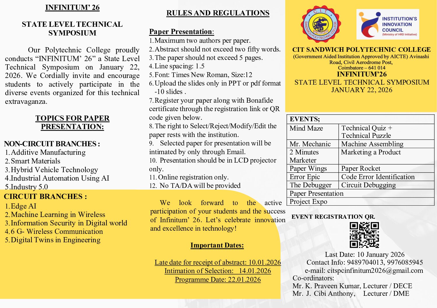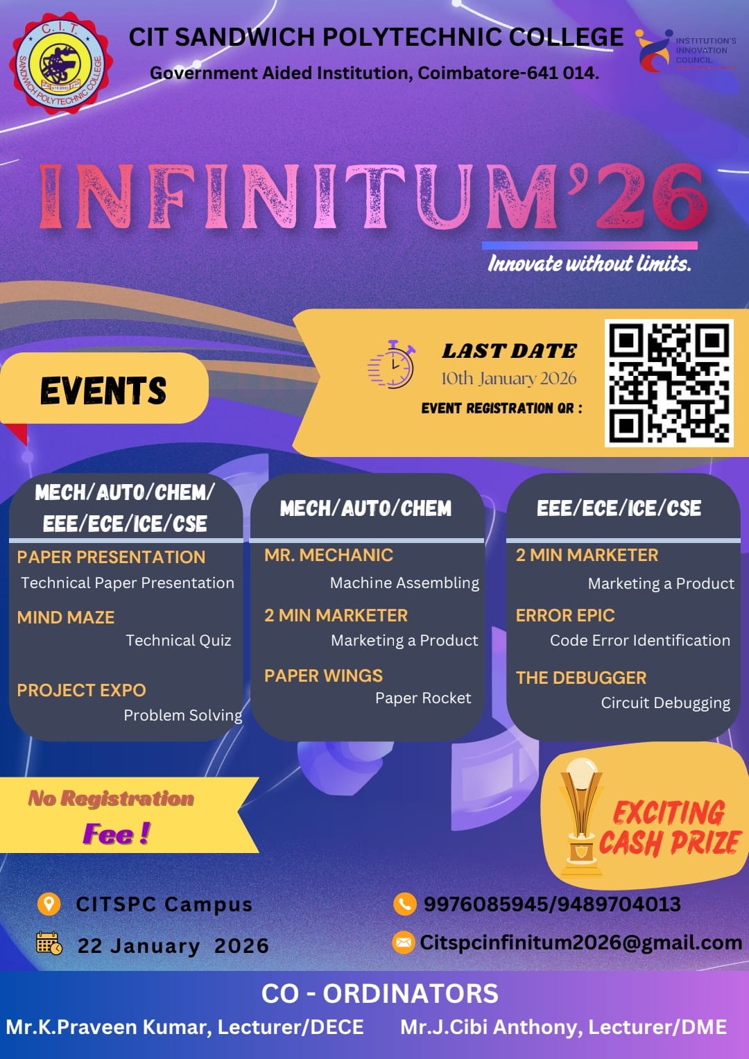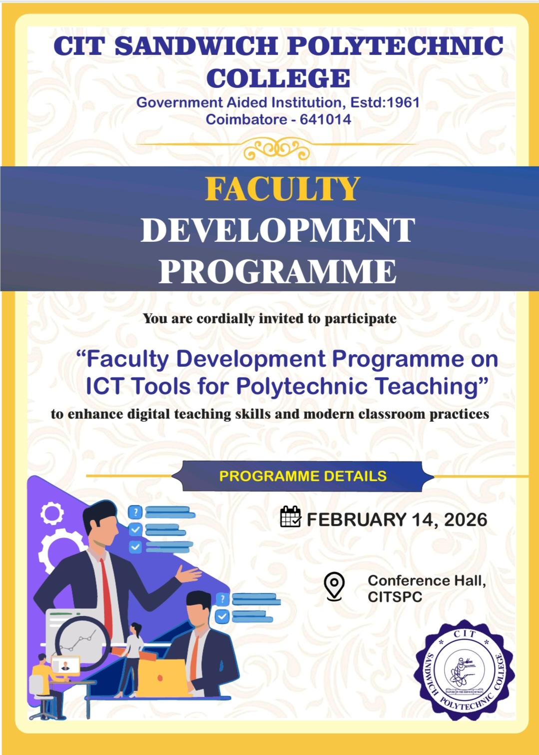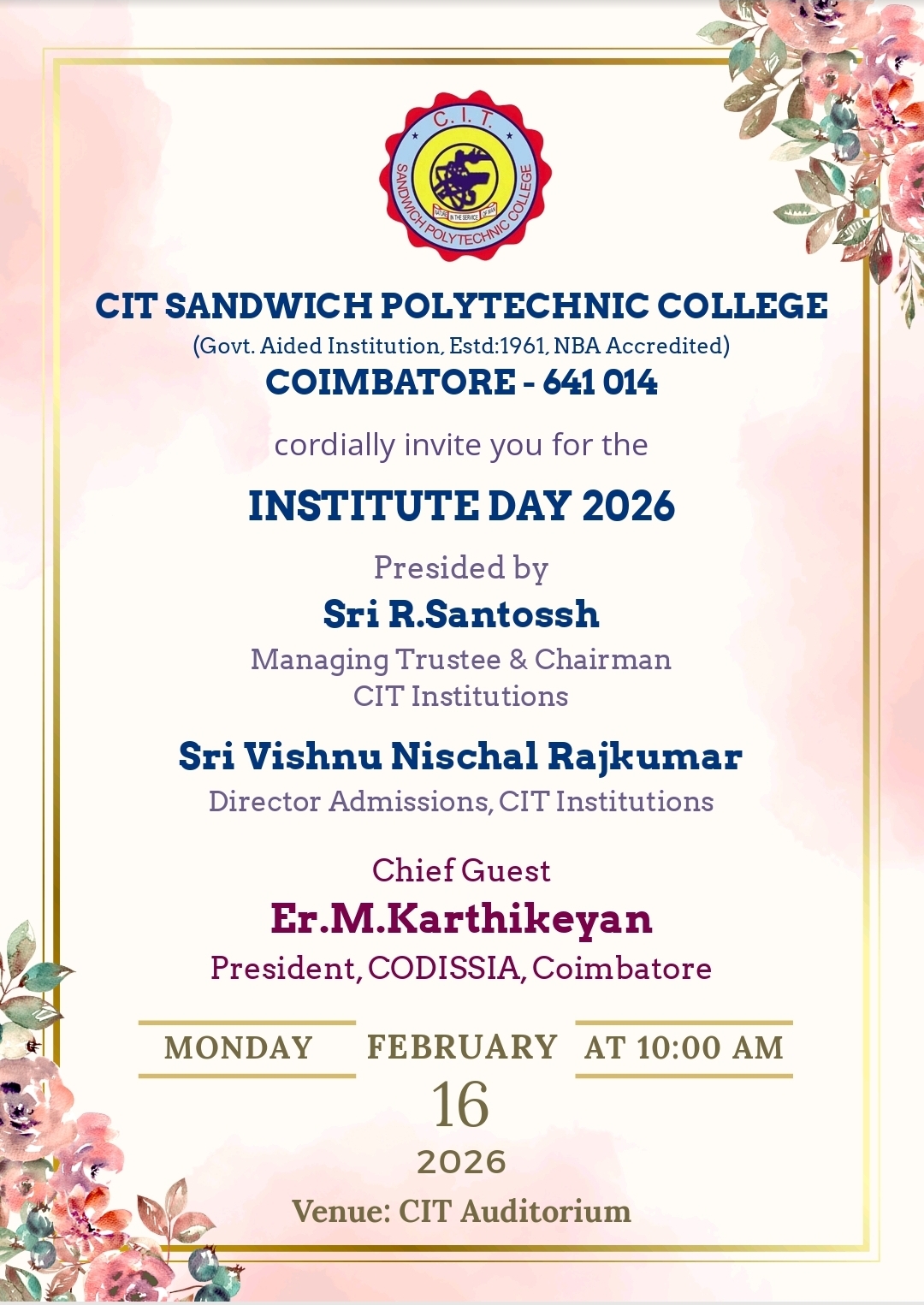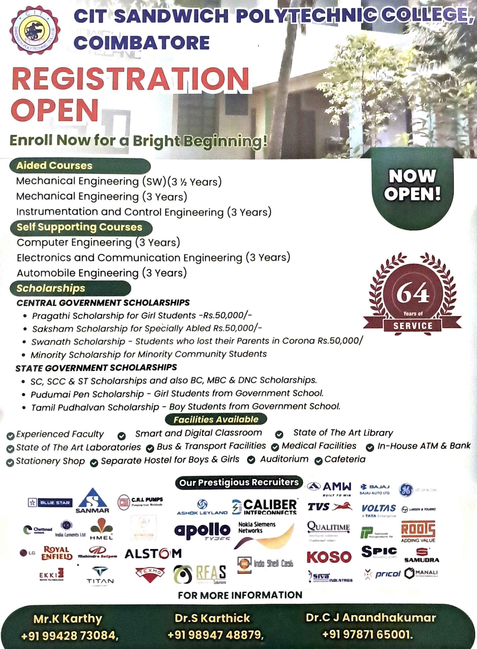 CIT Sandwich Polytechnic College, Coimbatore, a Government aided, co-educational institution, established and run by V. Rangaswamy Naidu Educational Trust is to offer post-matric level technical education in Full Time, Part Time and Sandwich modes, leading to the Diploma from the State Board of Technical Education and Training, Tamilnadu, in compliance with all Government and AICTE rules and regulations.